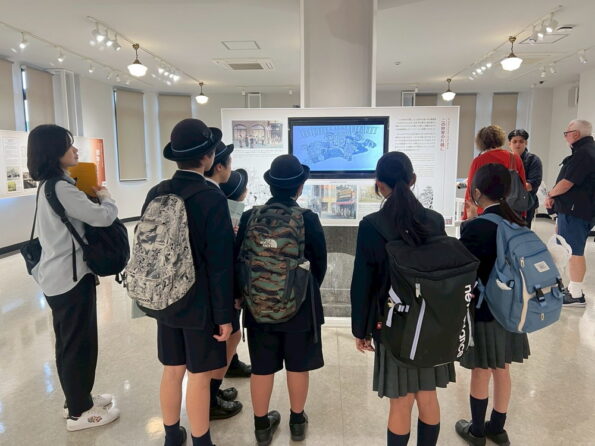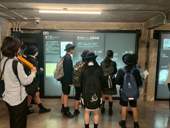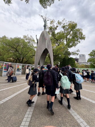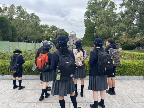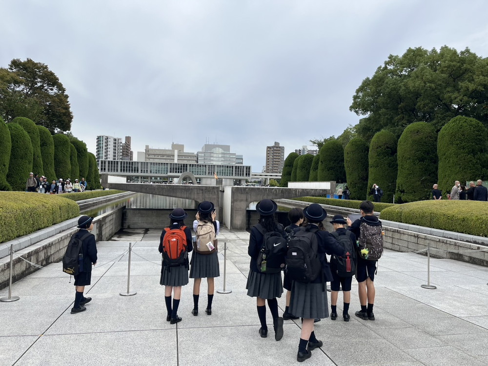 最後に『どこが印象に残った?』と尋ねたときも、クイズの内容を口にする生徒もいるほどでした。」「生徒たちは時間や約束をきちんと守り、周囲への配慮もしっかりできる、とても自立した姿が印象的でした。話を聞くときは静かに前のめりでメモを取り、英語で書く子もいるなど学ぶ姿勢がとても熱心でした。レストハウスの模型や公園内の植物に対して鋭い質問をしたり、国立広島原爆死没者追悼平和祈念館では「反時計回り=過去に戻るという意味だよね」と自分の知識と結びつけて考えるなど、探求心や思考の深さも感じました。」